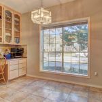 A breakfast nook is located at the side, beside huge windows that let in natural light.